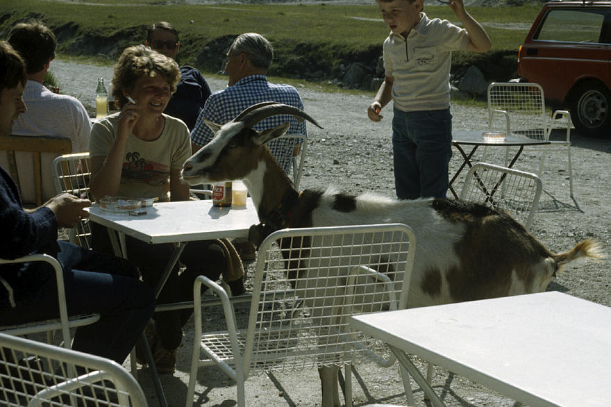 um 1986. Österreich. Alpen. Gebirge. Ein Ziegenbock zwischen den Tischen und Gästen einer Gaststätte.