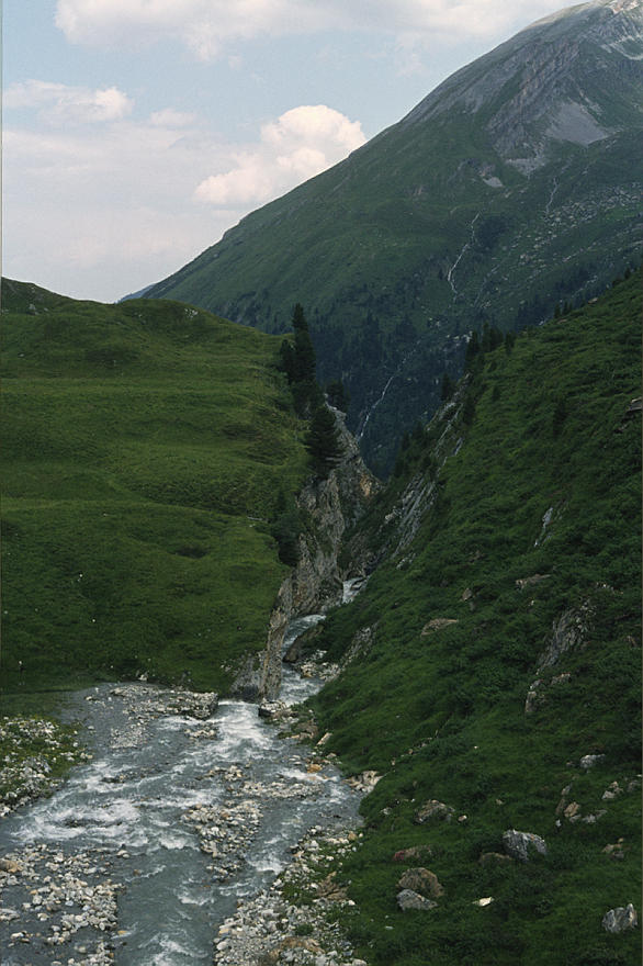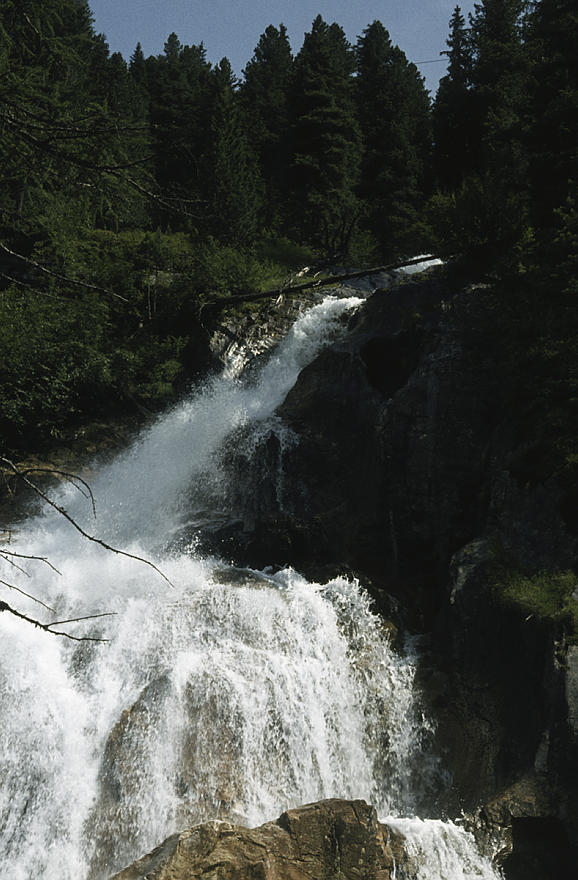 um 1986. Österreich. Alpen. Gebirge. Wasserfall. Reißender. reisender Bach. Fluß. Fluss. Wildwasser Berge. Alpen