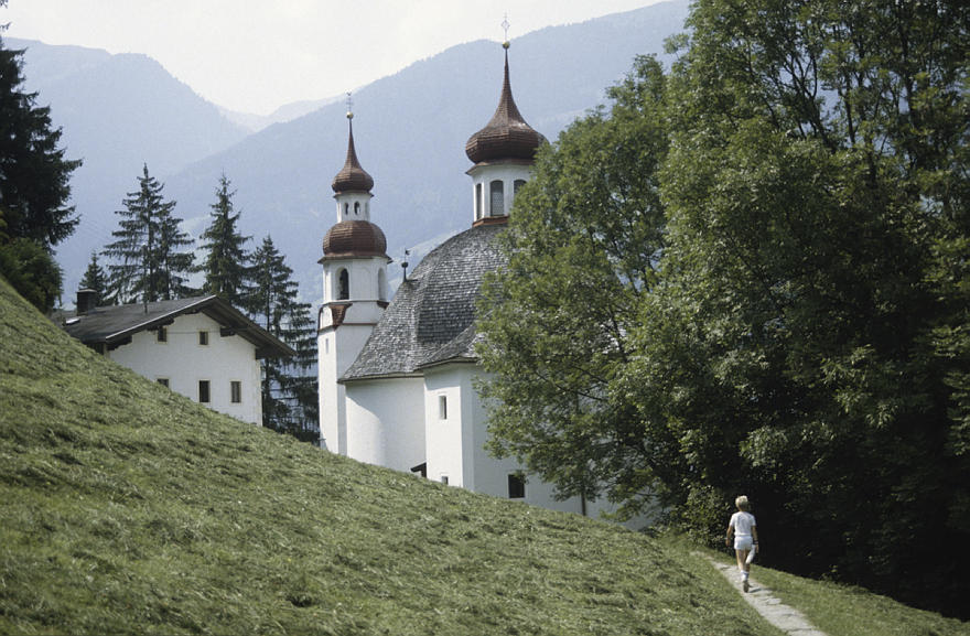um 1986. Österreich. Alpen. Gebirge. Ländliche Kirche Berge. Alpen