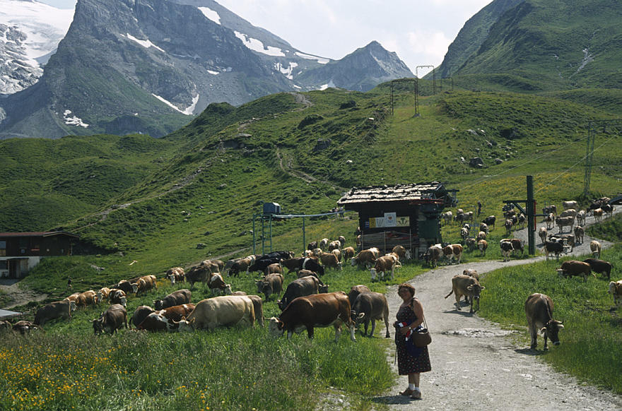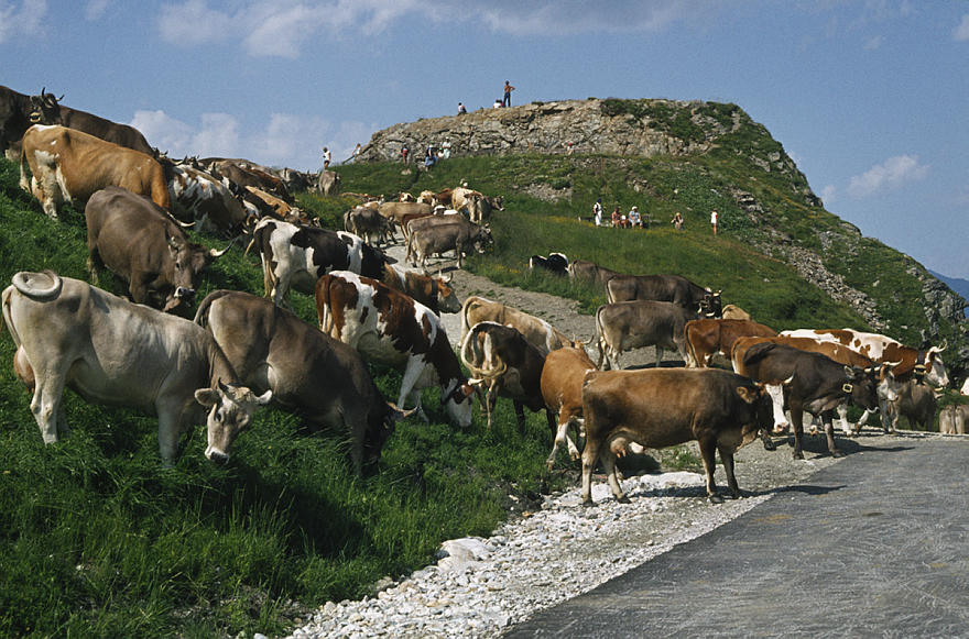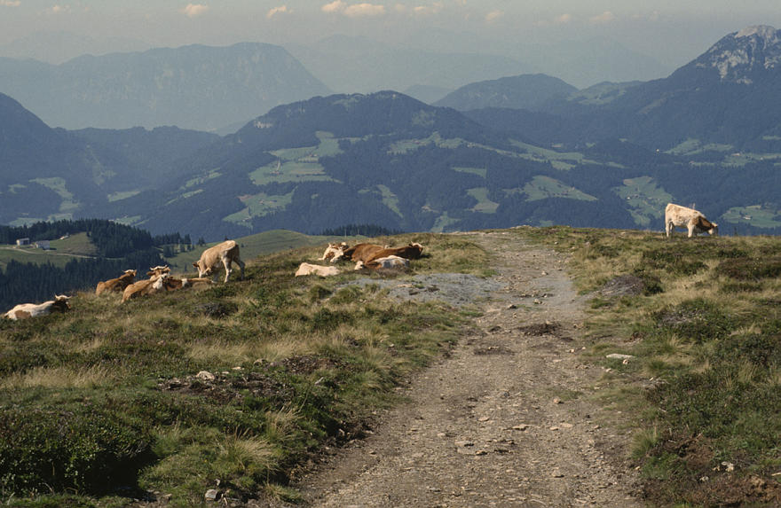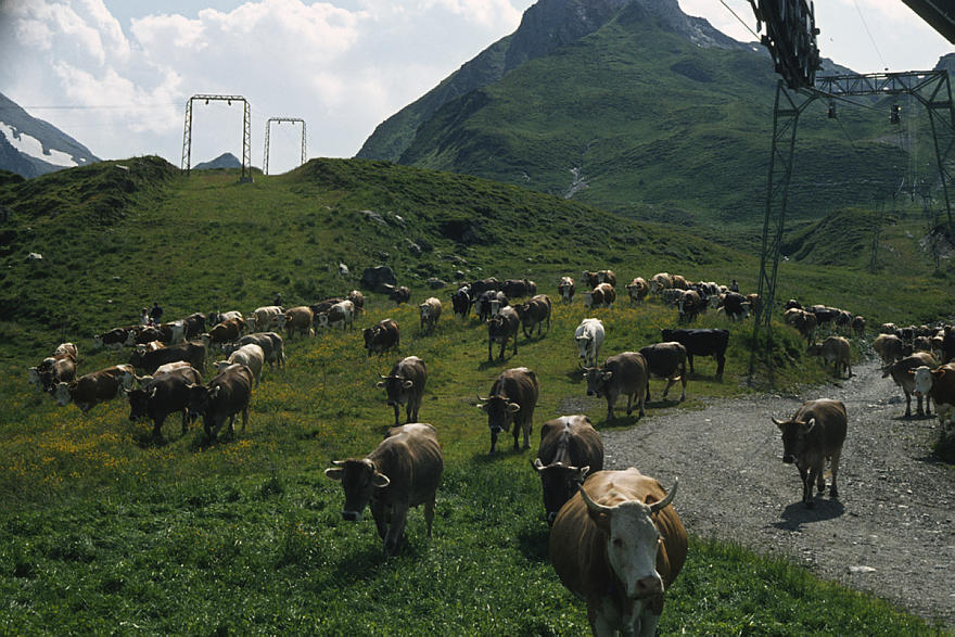 1986. Österreich. Tirol. Zillertaler Alpen. Tuxer Alpen. Rinder. Kühe. Kuhherde. Vieh auf der Alm. Viehzucht Berge. Alpen