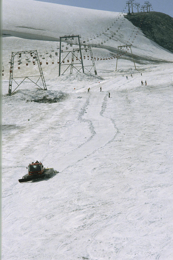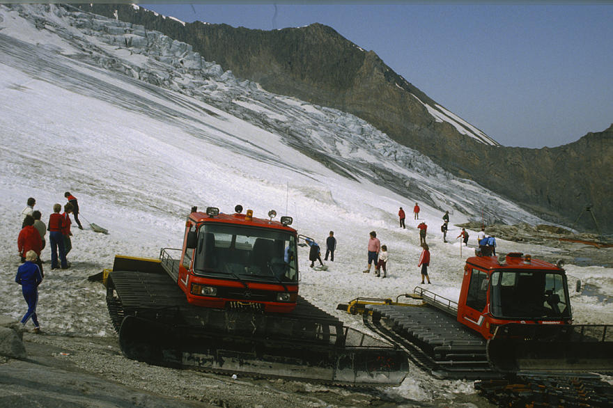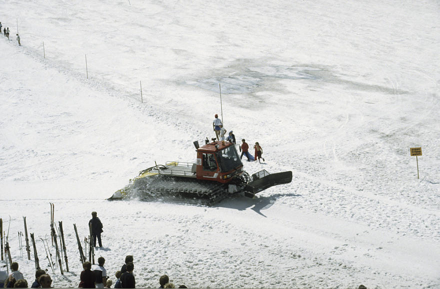 um 1986. Österreich. Alpen. Gebirge. Skigebiet. Schnee. Schneeräumfahrzeug. Pistenpflege. Berge. Alpen
