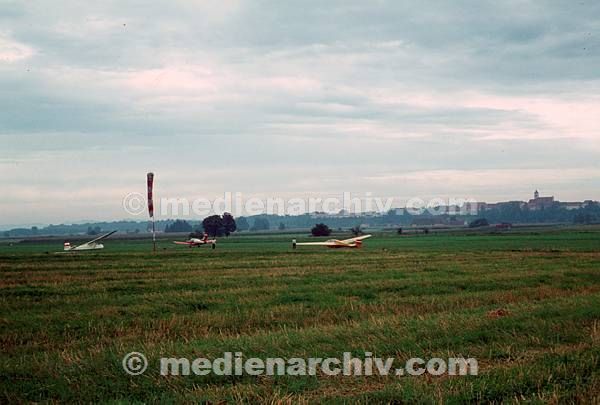 1960'er. Segelflugplatz mit Zwei Segelflugzeugen und ein Schleppflugzeug