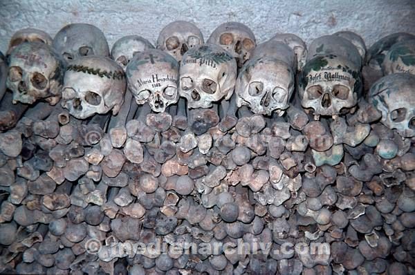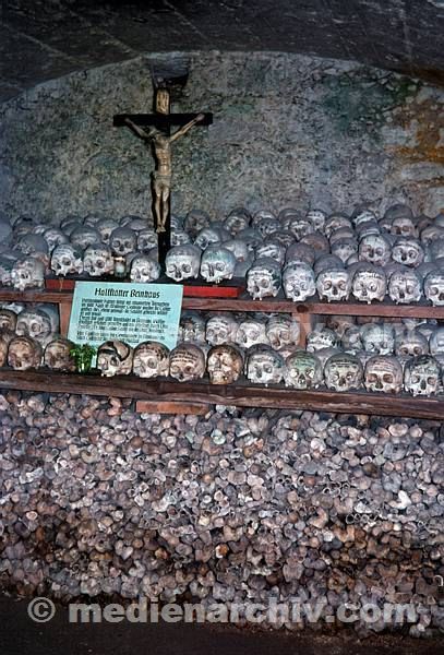 1960'er Jahre. Österreich. Tirol. Hallstatt. Hallstätter Beinhaus. Gebeine und Schädel
