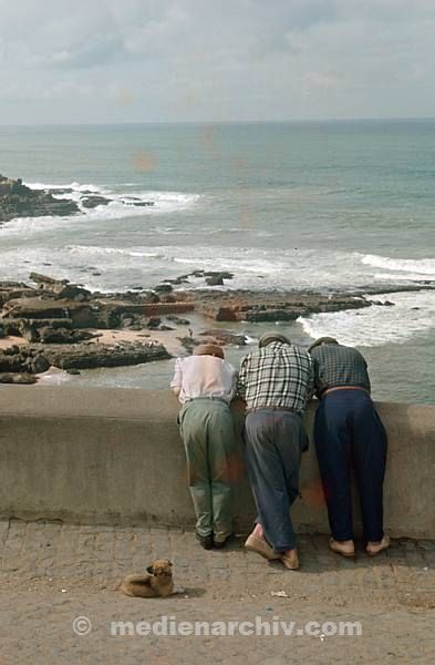 1963. Portugal. Meer. Drei Männer an einer Mauer