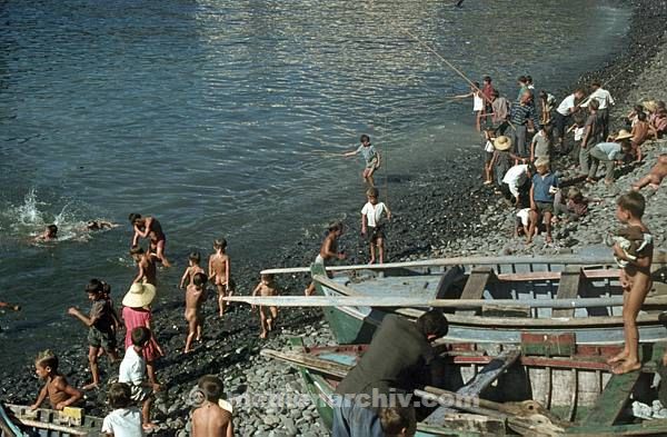 1968. Portugal. Insel Madeira. Lobos am Hafenstrand. Kinder am Strand. Boote