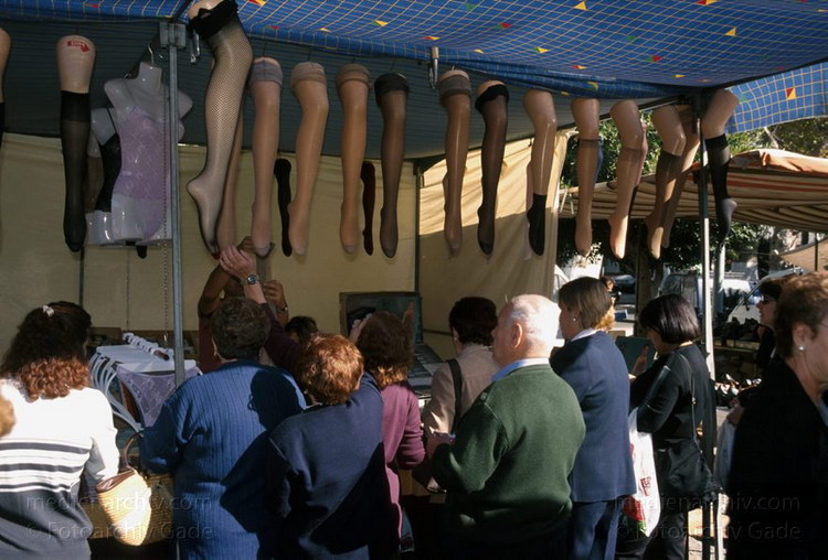 November 2000. Spanien. Andalusien. Costa del Sol. Almunecar. Markt. Stand für Damenstrümpfe