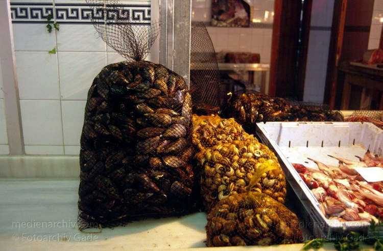 1997, Spanien, Andalusien, Costa del Sol, Markt in Almunecar. Muscheln am Fischstand