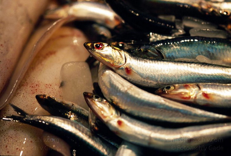 1997, Spanien, Andalusien, Costa del Sol, Fischmarkt im Almunecar, Boquerrones und Calamar