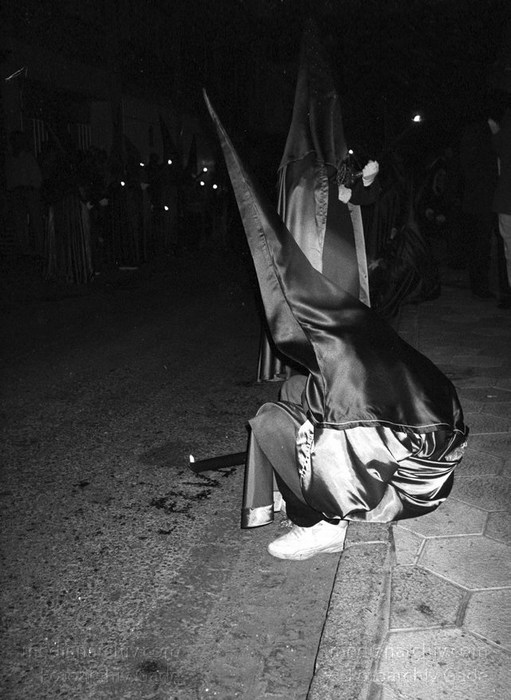 März 1993. Spanien. Andalusien. Semana Santa in Almunecar. Prozession. Umzug. Viele Teilnehmer tragen Umhänge mit spitzen Kapuzen.