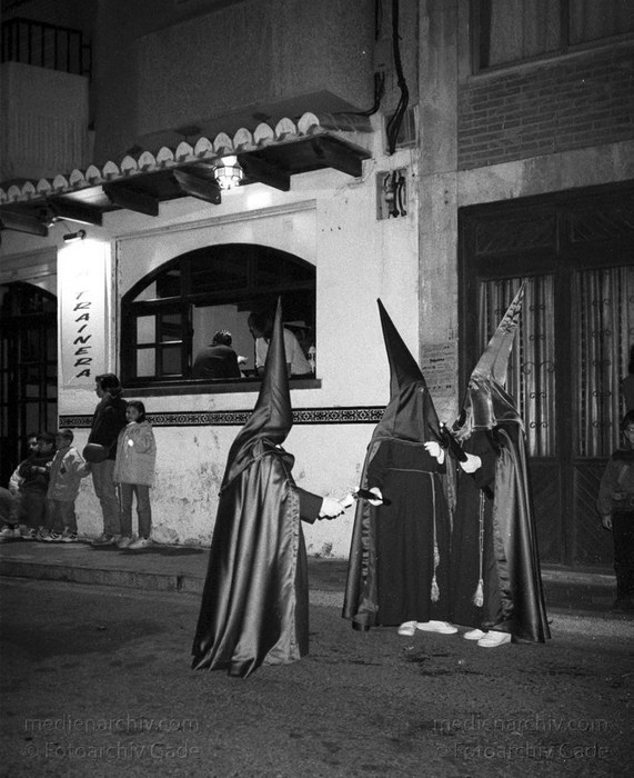 März 1993. Spanien. Andalusien. Semana Santa in Almunecar. Jugendliche mit spitzen Kapuzen bei einer Prozession.