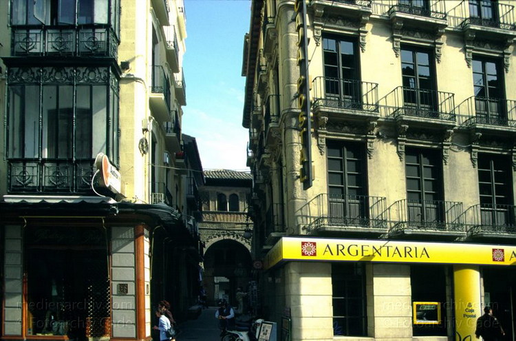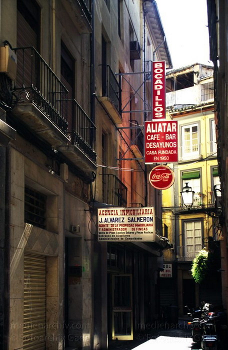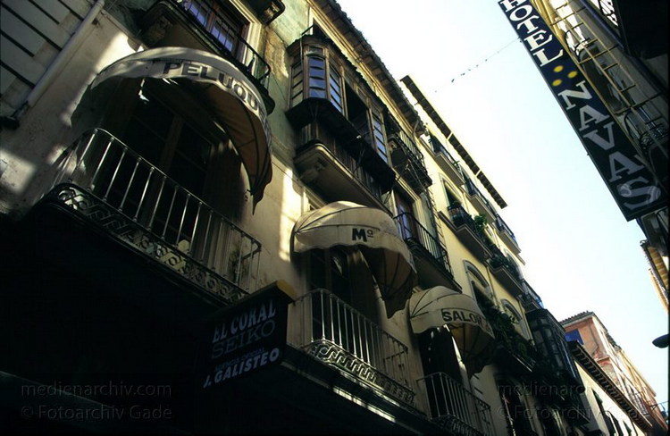 1997. Spanien. Andalusien. Granada. Gasse mit enger Bebauung, kleinen Balkons und beleuchteter Reklame.