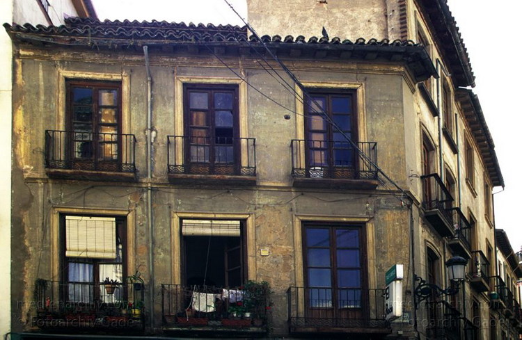 1997. Spanien. Andalusien. Granada. Fassade mit schmalen Balkons und Gittern.