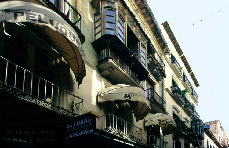 1997. Spanien. Andalusien. Granada. Fassade mit Balkons und halbrunden Markisen.