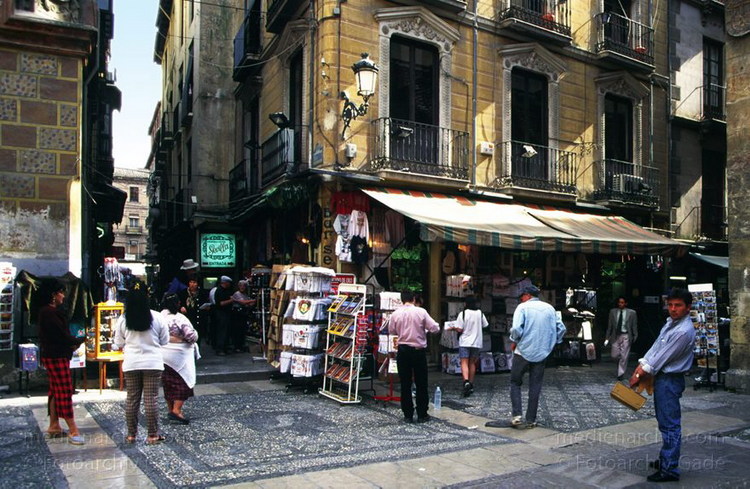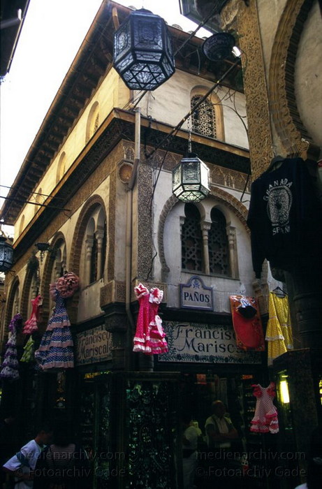 1997. Spanien. Andalusien. Granada. Enge Gassen. Fassaden mit maurischer Architektur. Souvenirshops.