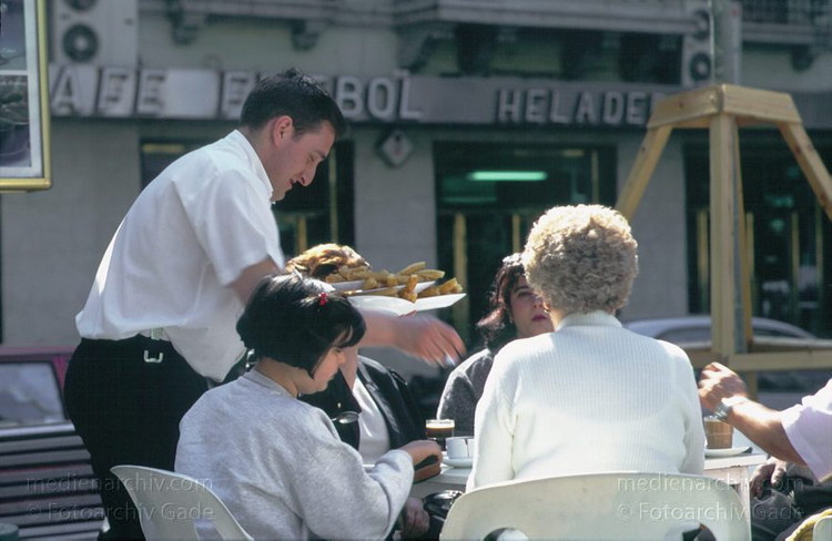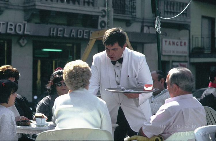 1997. Spanien. Andalusien. Granada. Straßencafe. Der Kellener serviert.