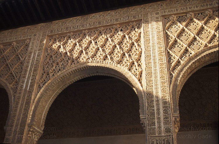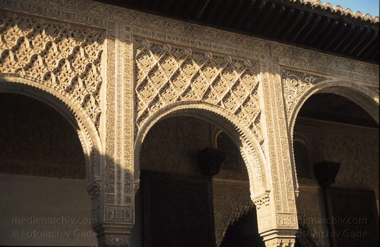 März 1997. Spanien. Andalusien. Granada. Alhambra. Maurische Architektur. Säulen und Bögen mit kunstvollen Ornamenten.