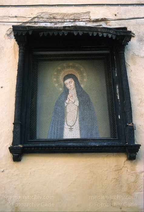 Spanien, 1998 Die Stadt Ronda gehoert zu den pueblos blancos (weiße Doerfer) in der Bergwelt Andalusiens. Sie liegt auf einem 723 Meter hohen Felsplateau ueber der Tajo Schlucht. Rondas beruehmte Bruecke, Puente Nuevo, wurde im 18. Jahrhundert gebaut. Marienbildnis an einer Hauswand. Religion.