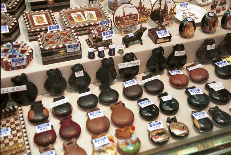 November 2000. Spanien. Andalusien. Sevilla. Kastagnetten im Schaufenster