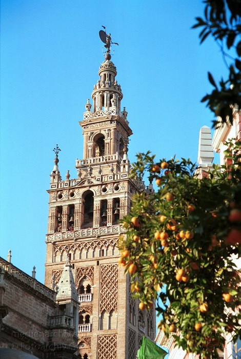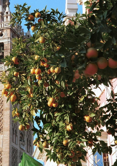 November 2000. Spanien. Andalusien. Sevilla. Orangen vor der Giralda.
