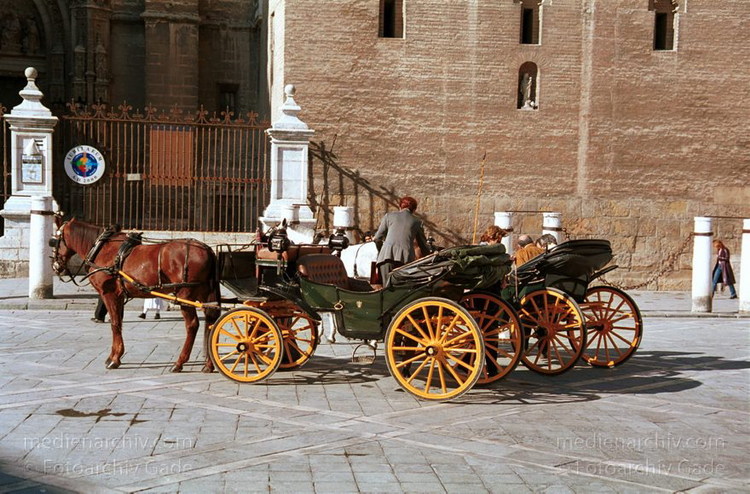 November 2000. Spanien. Andalusien. Sevilla. Kutschen auf dem Platz vor der Kathedrale