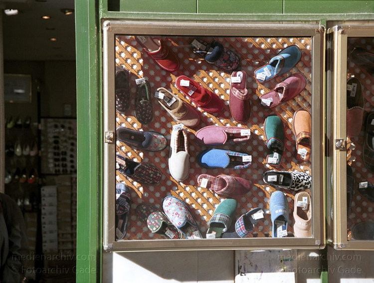 November 2000. Spanien. Andalusien. Sevilla. Schuhe in der Ladenvitrine.