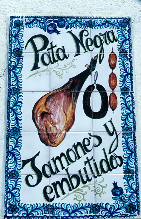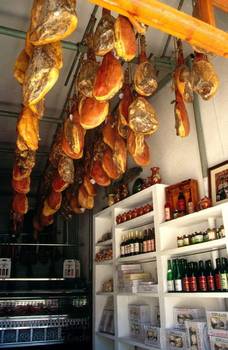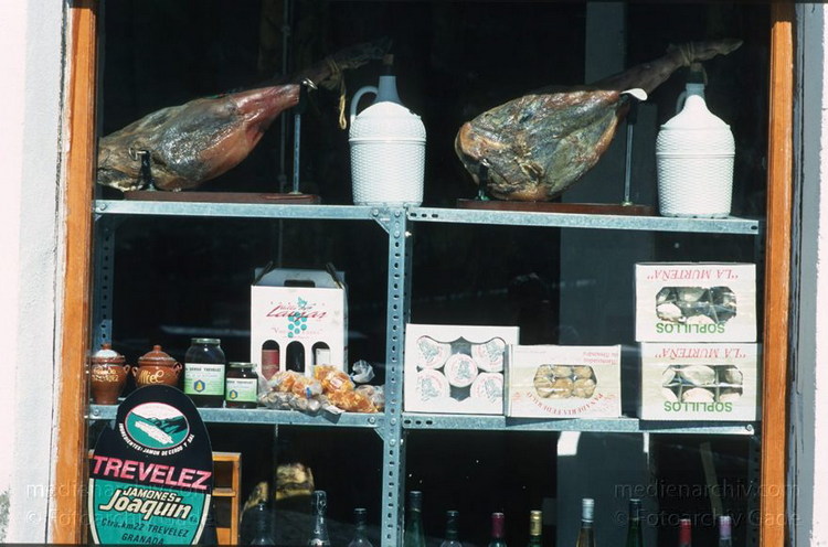 Spanien, 1997, Alpujarras, Trevelez (1476 m) gehört zu den weißen Dörfern in den Alpujarras. Dort werden luftgetrocknete Schinken produziert.