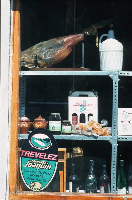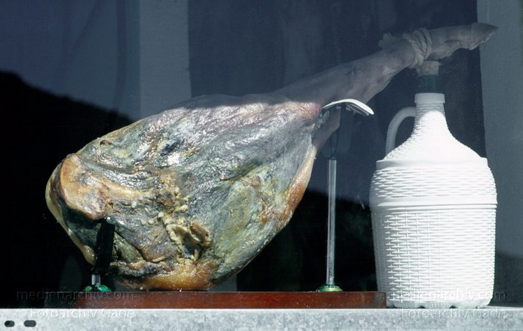 März 1997. Spanien. Andalusien. Trevelez. Weisses Dorf in den Alpujarras. Luftgetrockneter Schinken. Jamon Serrano - Spain. Andalusia. - España Andalucía. Las Alpujarras. Trevélez es un municipio español de la provincia de Granada