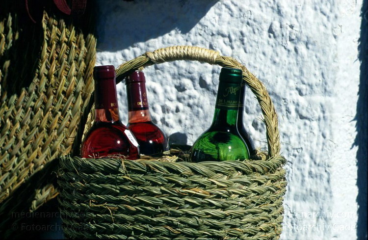 Spanien, 1997, Alpujarras, Trevelez (1476 m) gehört zu den weißen Dörfern in den Alpujarras. Korb mit Weinflaschen