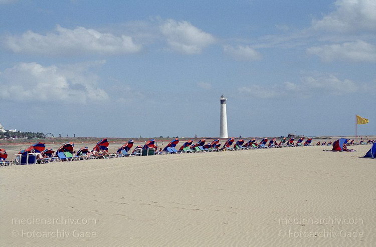 November 2001. Spanien. Kanarische Inseln. Fuerteventura. Jandia Playa. Strand. Liegestuhl. Liegestühle. Sonnenschirme. Leuchtturm. Urlauber. - Canary Islands. Beach