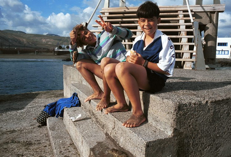 November 1993. Spanien. Kanarische Inseln. Lanzarote. Arrieta - Küste. Meer. Atlantik. Jungs auf der Mole