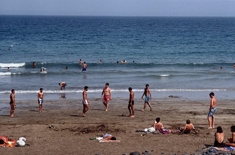 Juni 1994. Spanien. Kanarische Inseln. Lanzarote. Arrieta - Spain. Canary Islands - Küste. Meer. Atlantik. Meer. Am Strand. Schwimmen. Sonnen