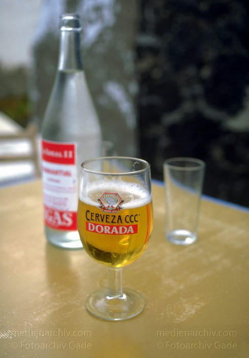November 1994. Spanien. Kanarische Inseln. Lanzarote. Arrieta - 1994. Lanzarote. Bierflasche Bierglas Dorada