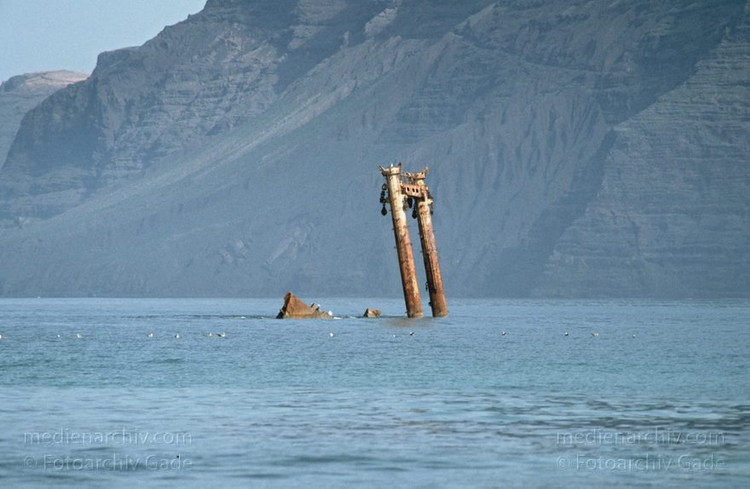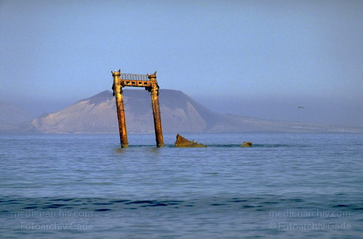 November 1994. Spanien. Kanarische Inseln. Lanzarote. Famara. Küste. Meer. Atlantik. Wrack vor der Küste bei La Caleta de Famara. Es ist fast schon ein Wahrzeichen. Im Hintergrund liegt die Insel La Graciosa.
