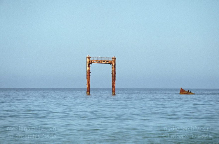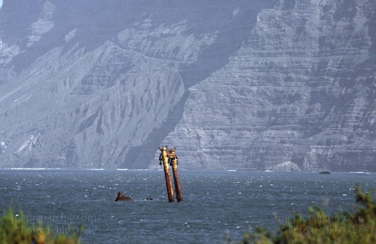November 1994. Spanien. Kanarische Inseln. Lanzarote. Famara. Küste. Meer. Atlantik. Wrack vor der Küste bei La Caleta de Famara. Es ist fast schon ein Wahrzeichen.