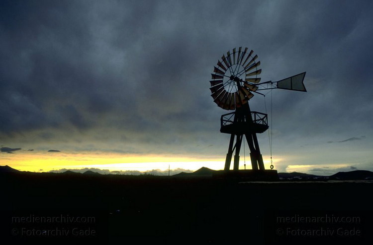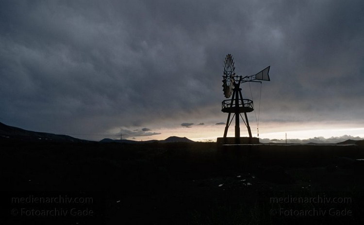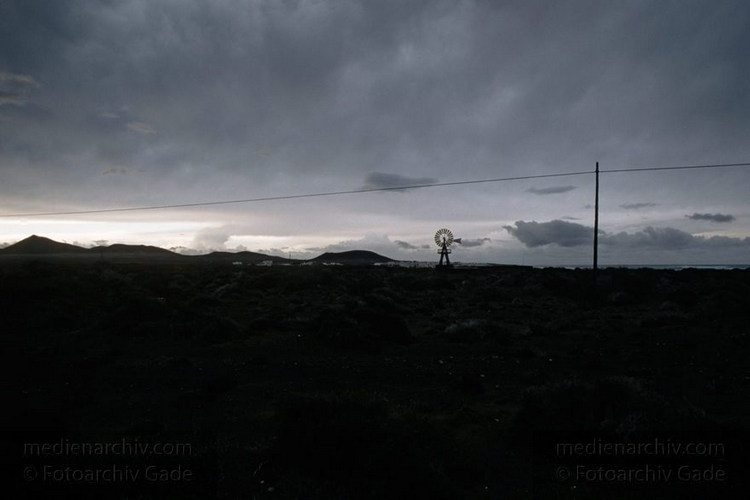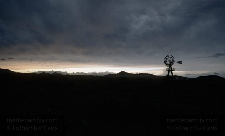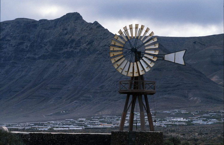 April 1995. Spanien. Kanarische Inseln. Lanzarote. Famara. Berge. Windmühle zum Fördern von Wasser zum Wäsche waschen.