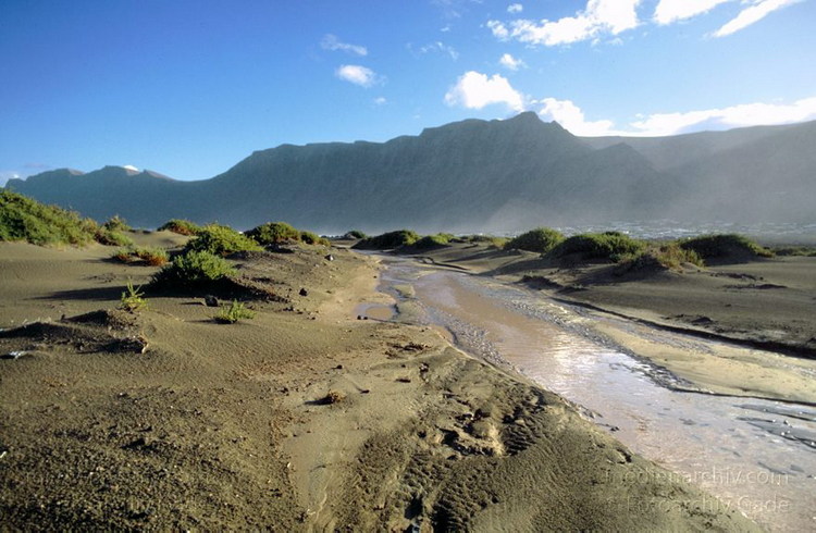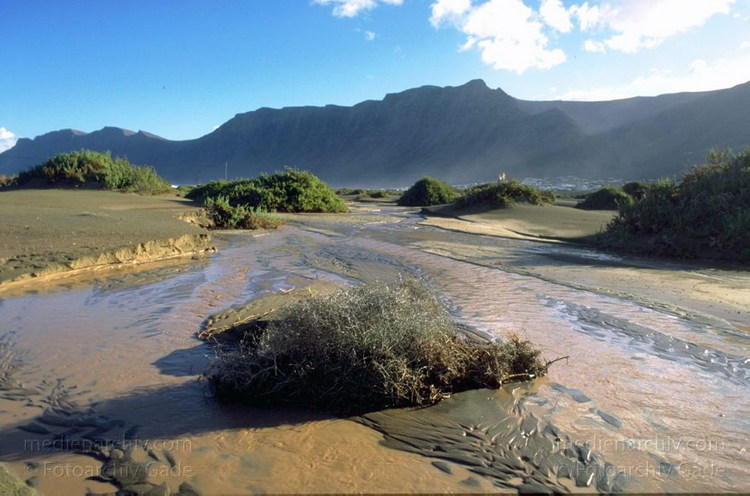 November 1995. Spanien. Kanarische Inseln. Lanzarote. Famara. Bei La Caleta nach einem heftigen Regenguß. Im Sand haben sich Bäche entwickelt, die nur kurze Zeit Wasser führen.
