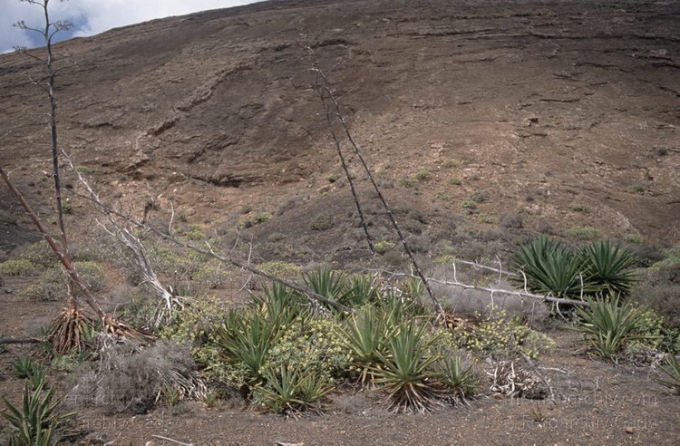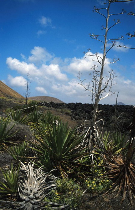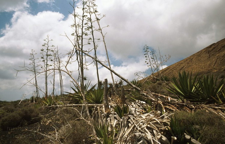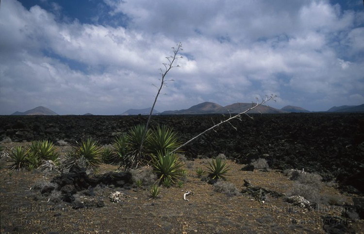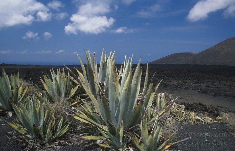 April 1994. Lanzarote. Kanarische Inseln. Spanien. Feuerberge - Nationalpark Timanfaya. Vulkane. Lava. Vegetation. Flora. Pflanzen. Agaven.