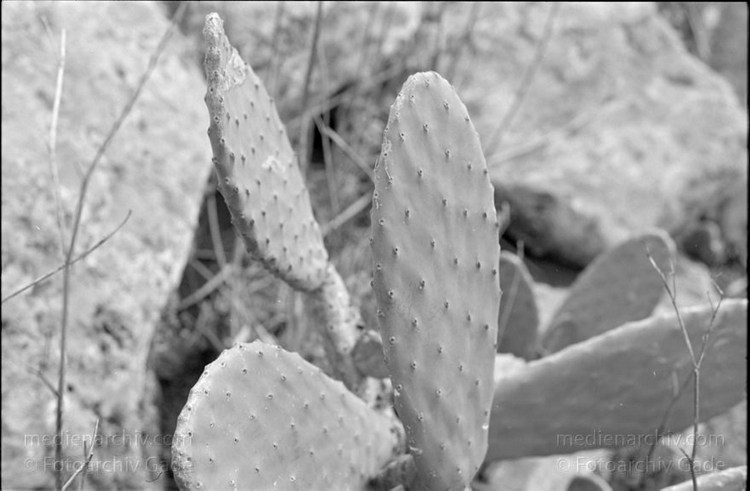 März 1995. Spanien. Kanarische Inseln. La Geria Weinanbaugebiet im Lavageröll. - Lanzarote. Spain. Canary Islands. - Espana. Islas Canarias. Kaktus. Kakteen
