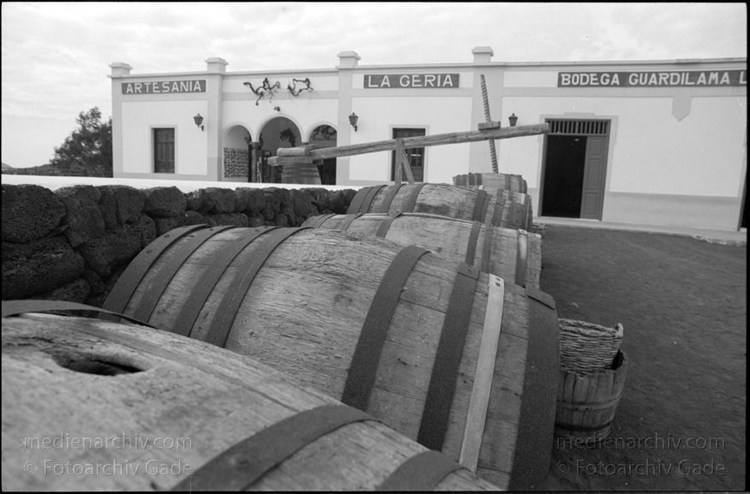 März 1995. Spanien. Kanarische Inseln. La Geria Weinanbaugebiet im Lavageröll. Weinfässer vor einer Bodega - Lanzarote. Spain. Canary Islands. - Espana. Islas Canarias.