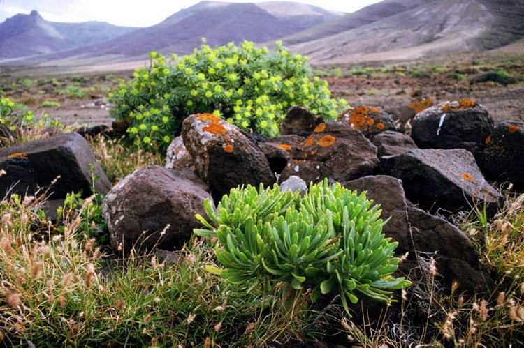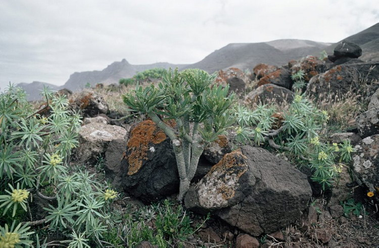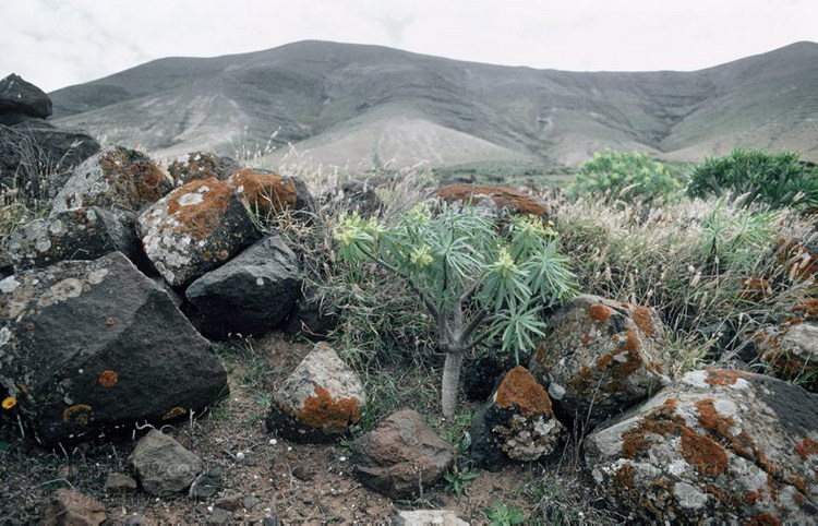 März 1991. Spanien. Kanarische Inseln. Lanzarote. Flora. Pflanzen. Vegetation. Wolfsmilchgewächs. Tabaiba. Moose. Flechten