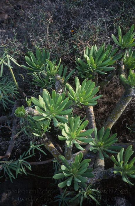 März 1991. Spanien. Kanarische Inseln. Lanzarote. Flora. Pflanzen. Vegetation. Wolfsmilchgewächs. Tabaiba
