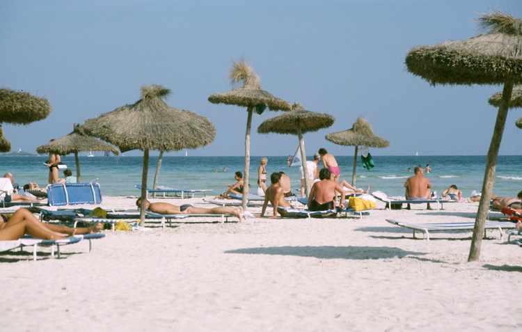 1989. Spanien. Balearen. Mallorca. Strand. Mittelmeer. Sonnenschirme. Meer