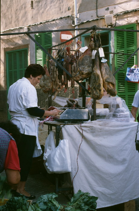 1989. Spanien. Balearen. Mallorca. Olivenverkäuferin.