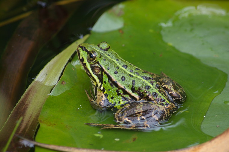 23. 6. 2019. Brandenburg. Linum. Fauna. Tier. Frosch. Teichfrosch auf Seerosenblattblattblättern. Pelophylax kl. esculentus