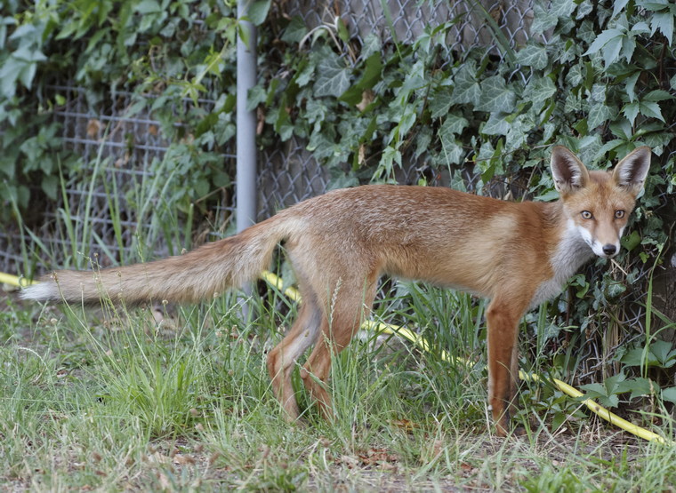 11. 8. 2021. Berlin. Fauna. Tier. Fuchs. Auf dem Geländer der Bootsstände Lahe.