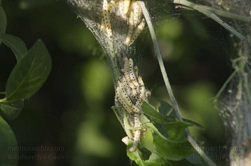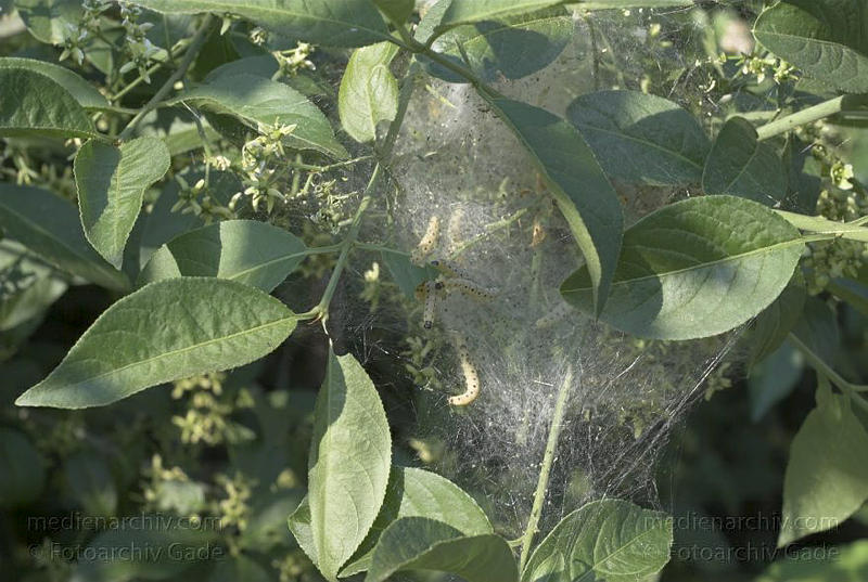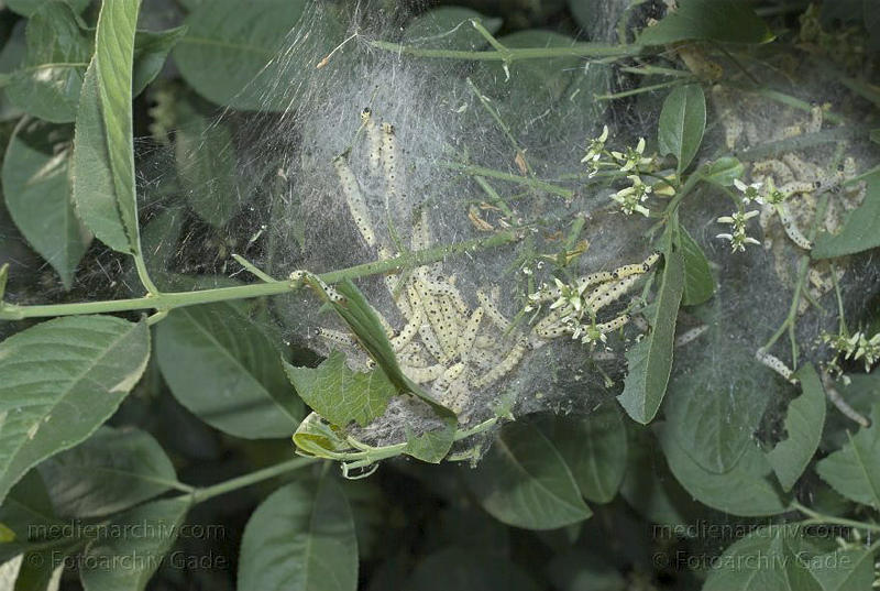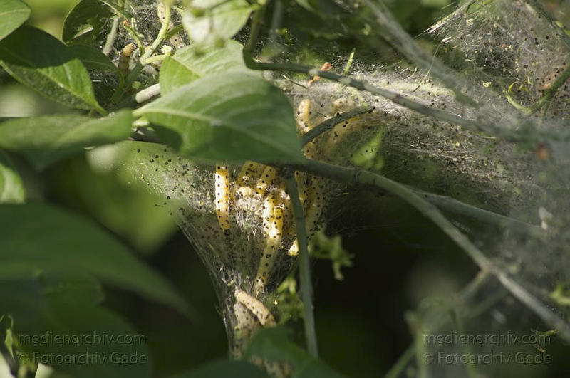 1. Mai. 2009 Berlin. Wedding. Am Nordufer. Raupen der Miniermotten am Strauch. Gespinstmotten