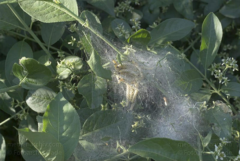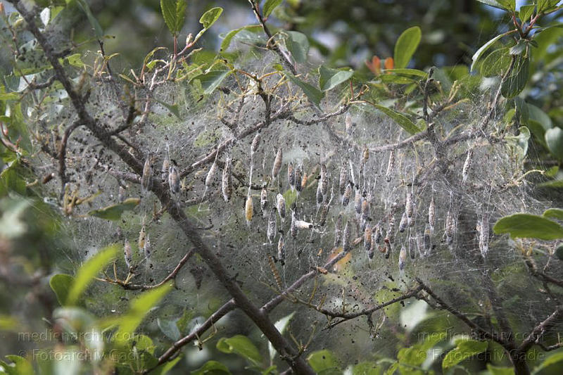2009. Mecklenburg-Vorpommern. Feldberger Seenlandschaft. Carwitz. Fauna. Tiere. Insekten. Raupen im Netz. Miniermotten.