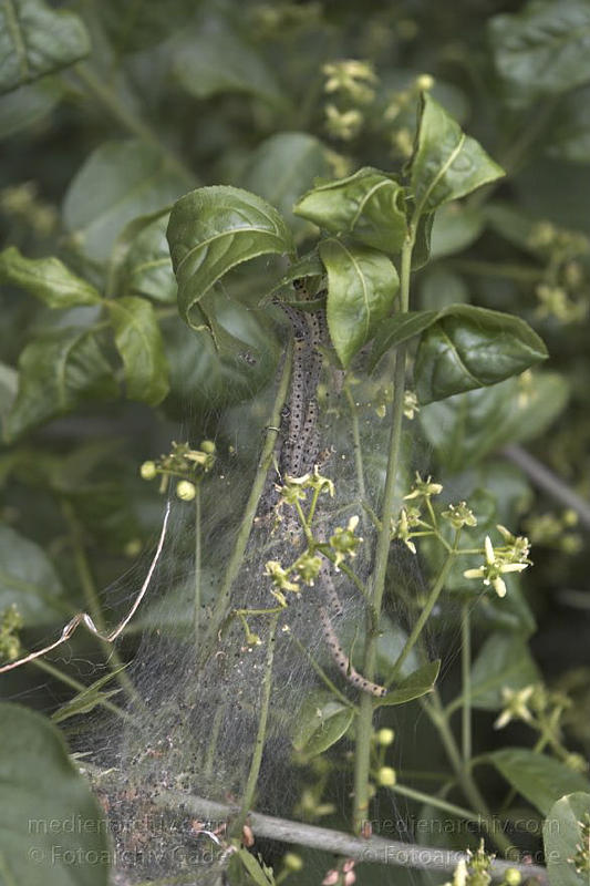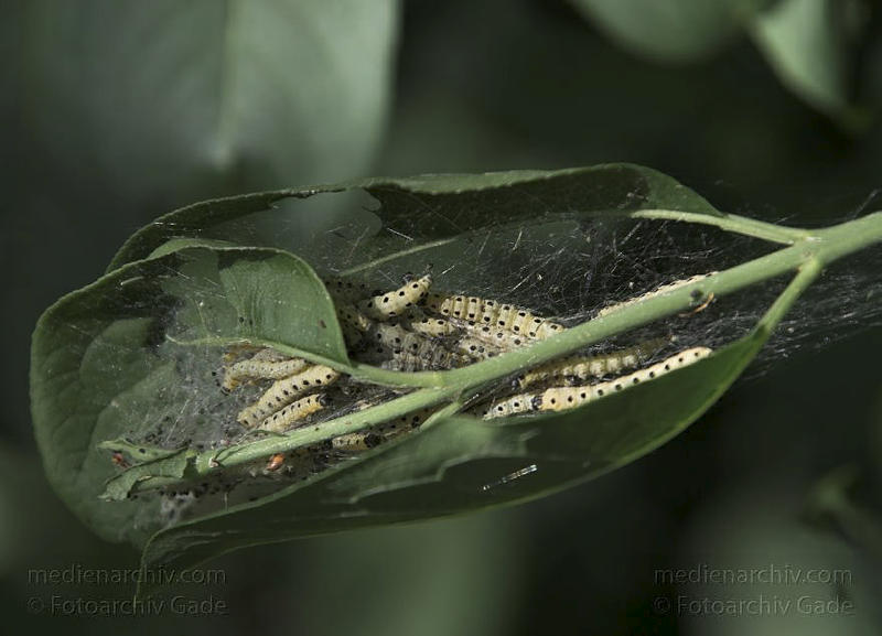 7. 5. 2014. Berlin. Fauna. Insekten. Raupen. Gespinstmotten. Knospenmotten (Yponomeutidae) an Sträuchern am Nordufer