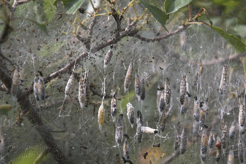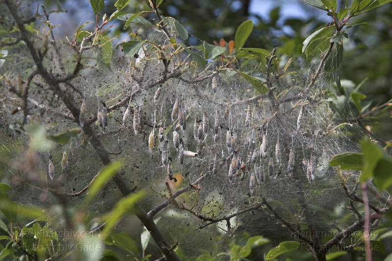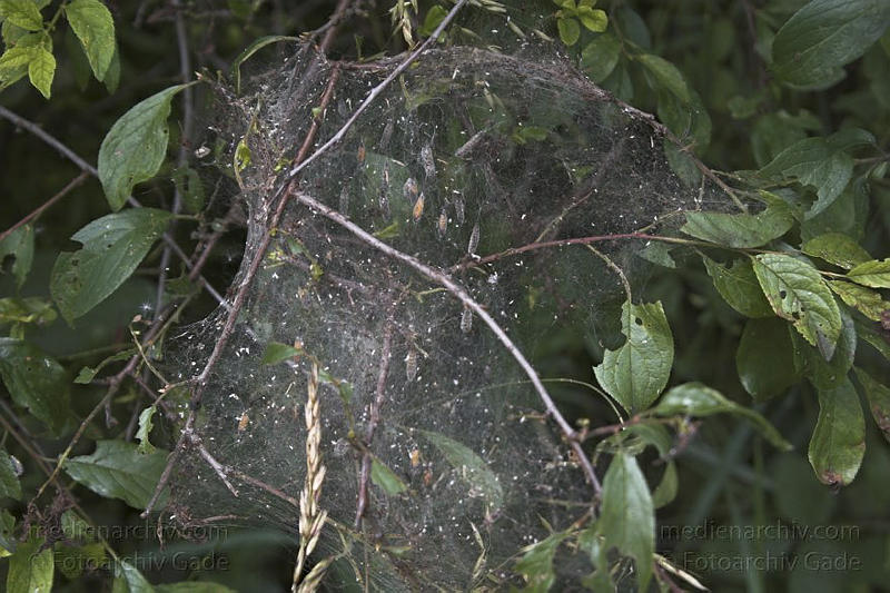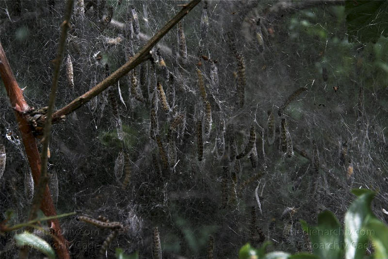 23. 6. 2006. Mecklenburg-Vorpommern. Feldberger Seengebiet. Carwitz. Fauna. Tiere. Insekten. Raupen der Gespinstmotten. Netz, Kokon.