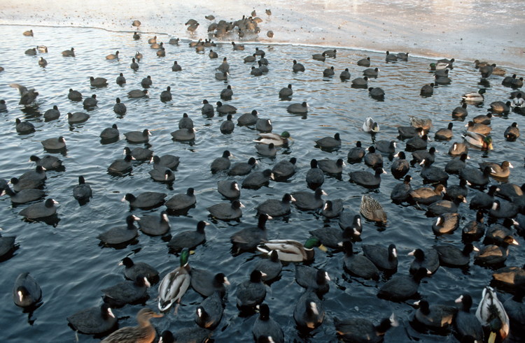Januar 1996. Berlin. Havel. Vögel bei der Pfaueninsel. Tiere. Fauna. Wasser. Eis. Winter